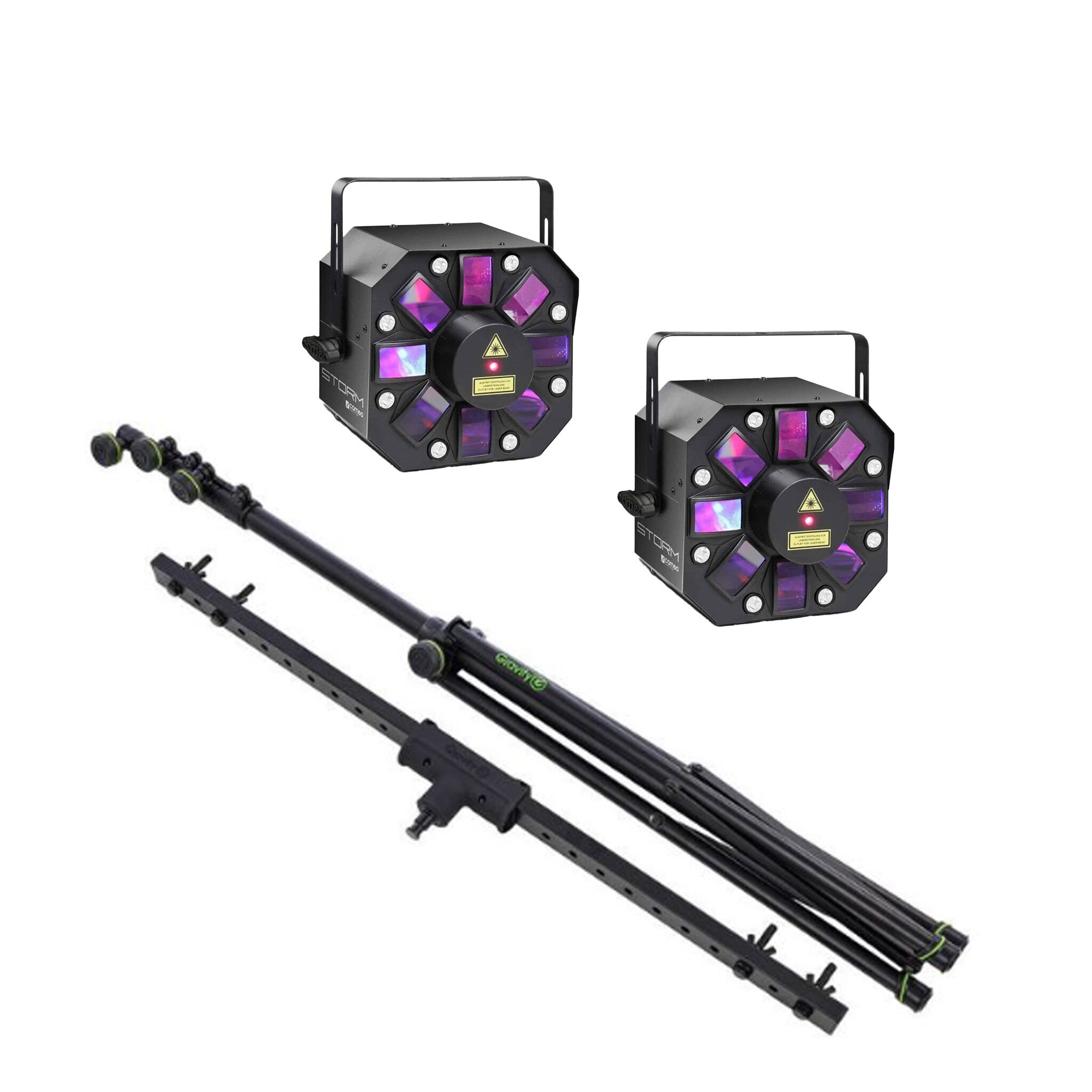 Cameo storm er en alsidig lampe som kombinerer derby, laser og strobe- effekter. Alt i en lampe! Lampen kan styre seg selv i takt med musikken, gå på forhåndsprogramerte programmer eller styres vi DMX.